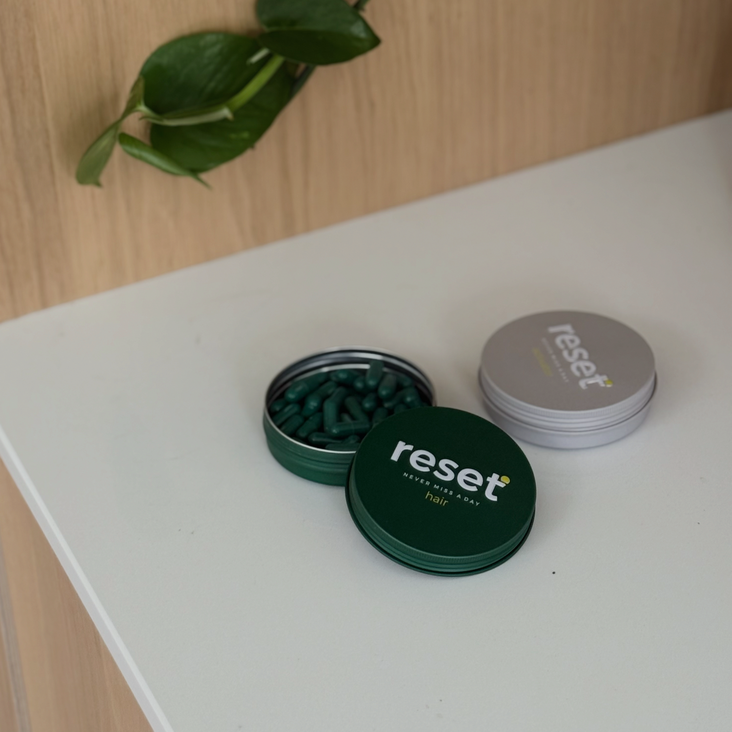 - 1 green tin labeled Reset Hair, containing 60 green capsules